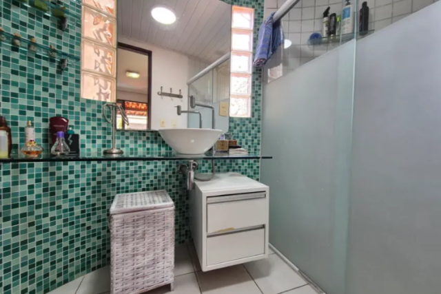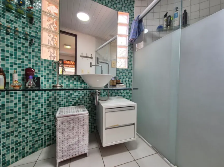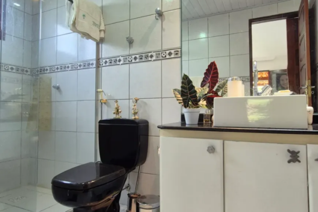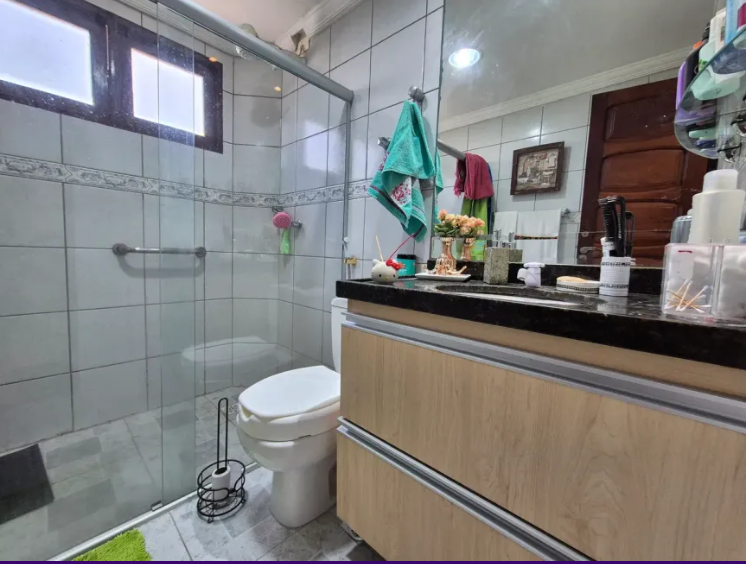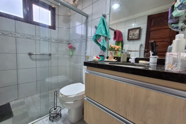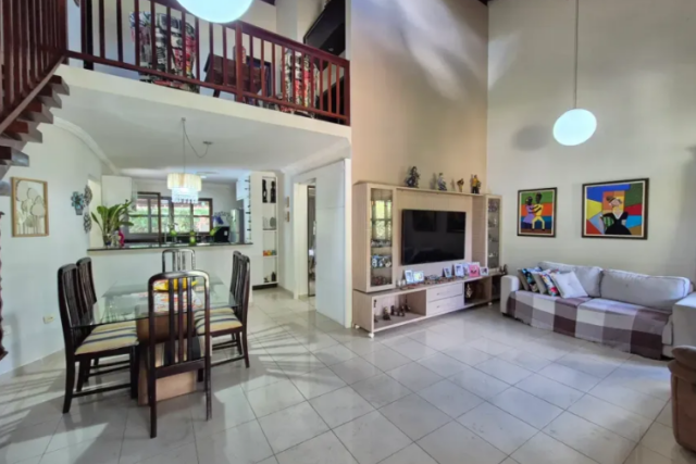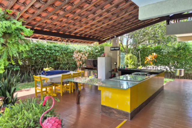 No térreo temos: piscina, espaço gourmet, varanda em L, sala para 2 ambientes, 1 suíte (sendo o banheiro reversível), cozinha americana, área de serviço, quarto e banheiro de serviço;
